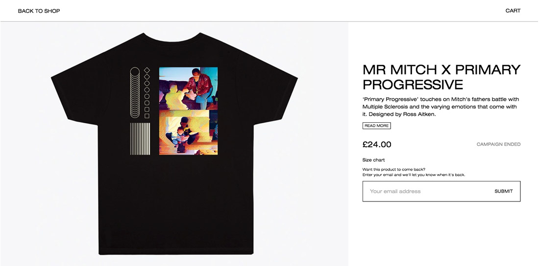 To coincide with the release of his album Primary Progressive last November, Mr Mitch launched a T-shirt designed in collaboration with Ross Aitken. The album explores the musician’s father’s battle with primary multiple sclerosis, and the tees feature Aitken’s abstract images of Mr Mitch with his father, which were also used for the album cover. The pair have worked together before, with Mitch using Ross’ photos for his mixes, so this was a natural next step in their artistic relationship.