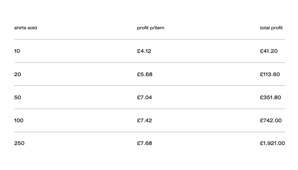 To give you an idea of how your profit scales as your total sales increase, we’ve prepared a breakdown below. For this one we’ve used a plain white Essentials Classics T-shirt with just one artwork on the front, selling at £25.